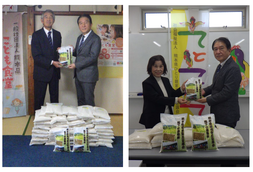 本協議会では社会貢献活動の一環として収穫米の一部を寄贈しています。今年は、金森秀一会長(株式会社オジックテクノロジーズ取締役会長)から、「一般社団法人熊本県こども食堂ネットワーク」及び「社会福祉法人熊本県ひとり親家庭福祉協議会てとてとて」の2団体に各100kgを贈呈しました。